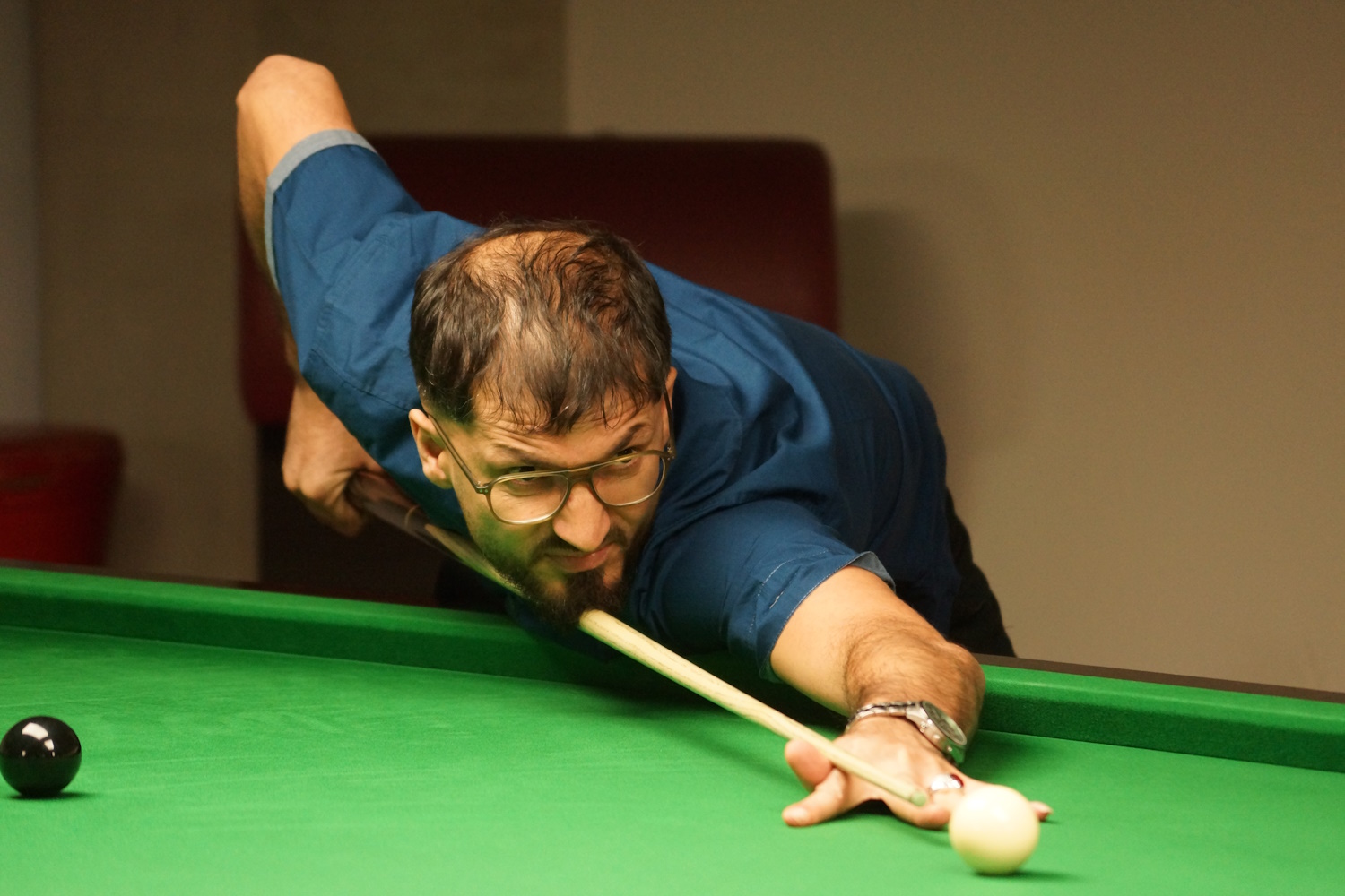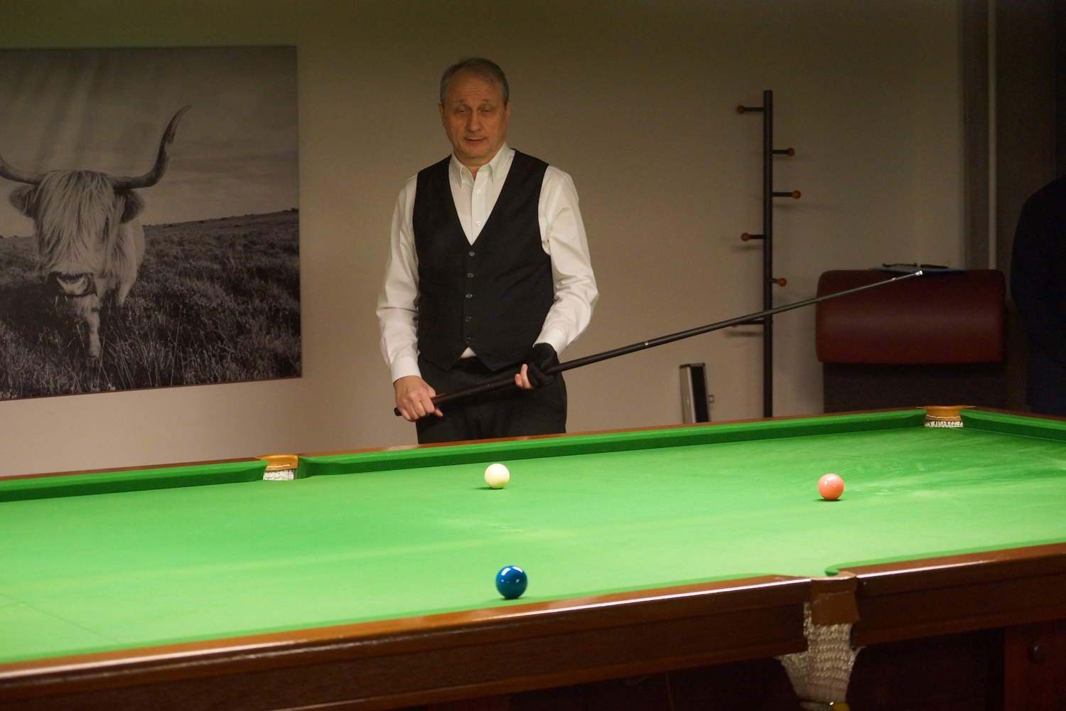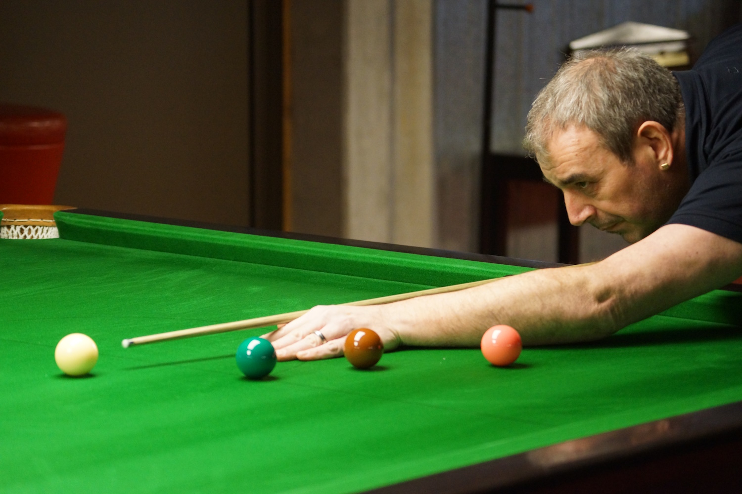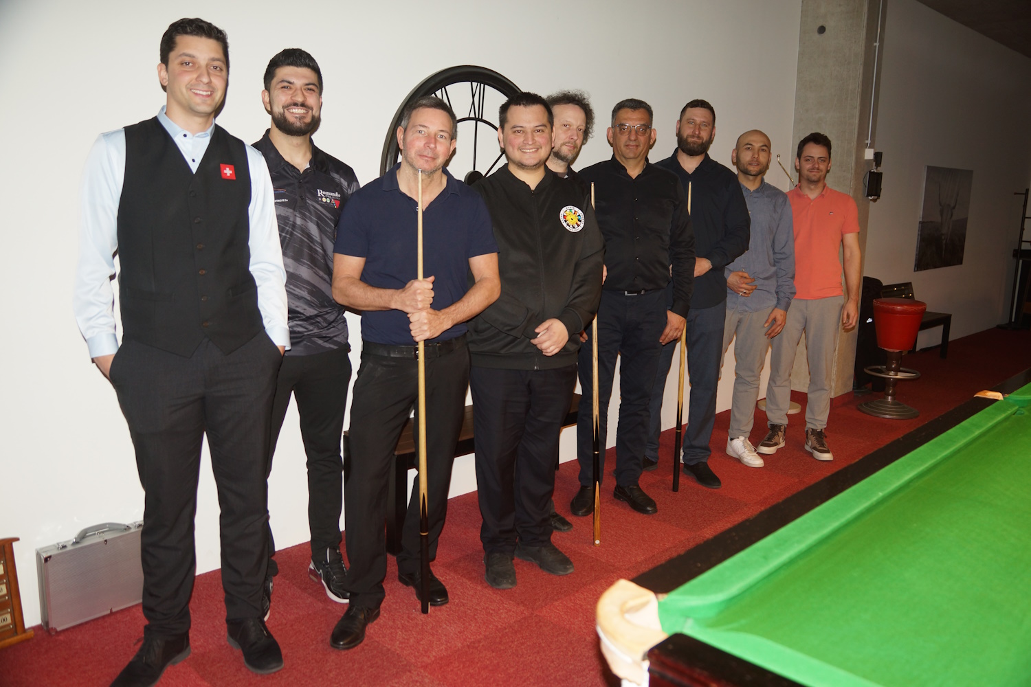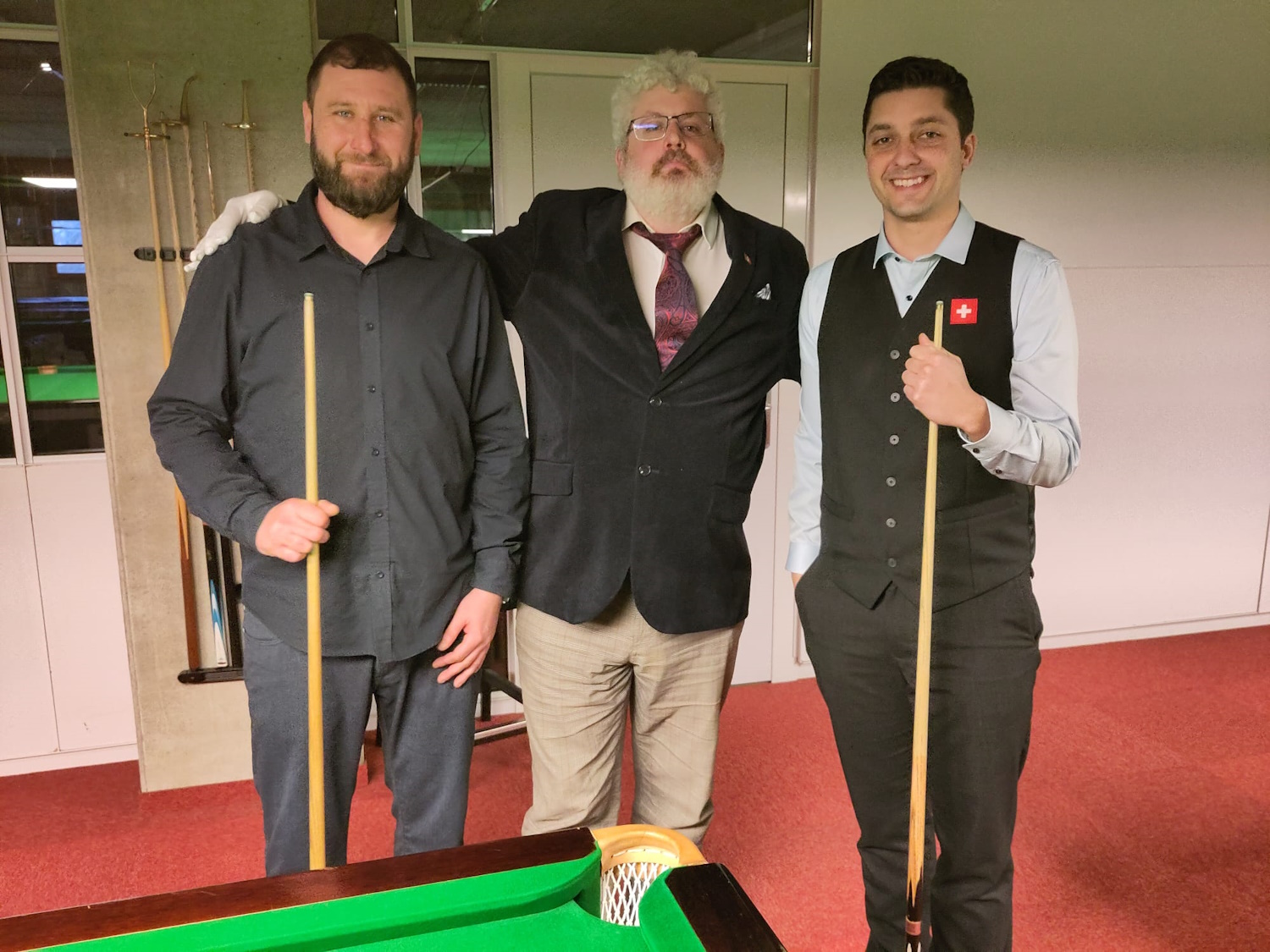 Die beiden Berner Klubkollegen lieferten sich eine lange Abnützungsschlacht, welche den anderen Spielern eine längere Pause ermöglichte. Gabriel lag bereits mit 2:0 vorne, als es ihm nicht gelang, den Sack zuzumachen. Marco (the Chester) biss sich fest, kämpfte sich zurück und erzwang den Decider. Da ging ihm dann allerdings die Puste aus und er ärgerte sich gewaltig über sich selbst, hatte er doch seinem Gegner gleich mehrfach die Bälle vor die Taschen gelegt.
