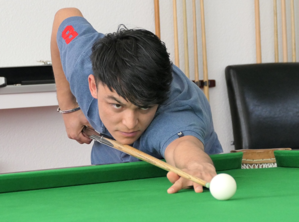 Nach einer 1. Chance von Peer mit 7 Punkten, verpasst Alisina 2x einen machbaren Einsteiger. In diesem ruckeligen Start mit verpassten Chancen auf beiden Seiten, fällt Peer beim kreiden des Queues seine Kreide aus der Hand auf den Tisch und genau auf eine der Roten – Foul. Nach ein paar weiteren kleinen Breaks von Beiden und einem schönen Double von Alisina steht es 23:33 für Peer mit 35 Punkten noch zu vergeben. Nach einem erneuten Foul von Peer beschert es Alisina einen Freeball (der durch Überraschungsgast Nationaltrainer Urs Freitag bestätigt wurde), allerdings pottet Alisina nur die nominierte Gelbe. Das Hin und Her mit kleinen Breaks geht weiter bis Alisina den Frame auf Blau für sich entscheidet.