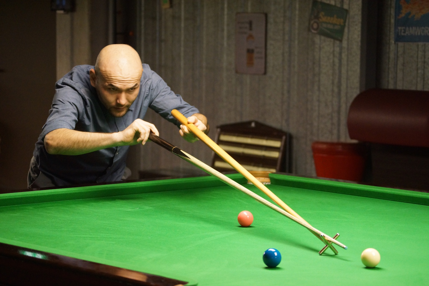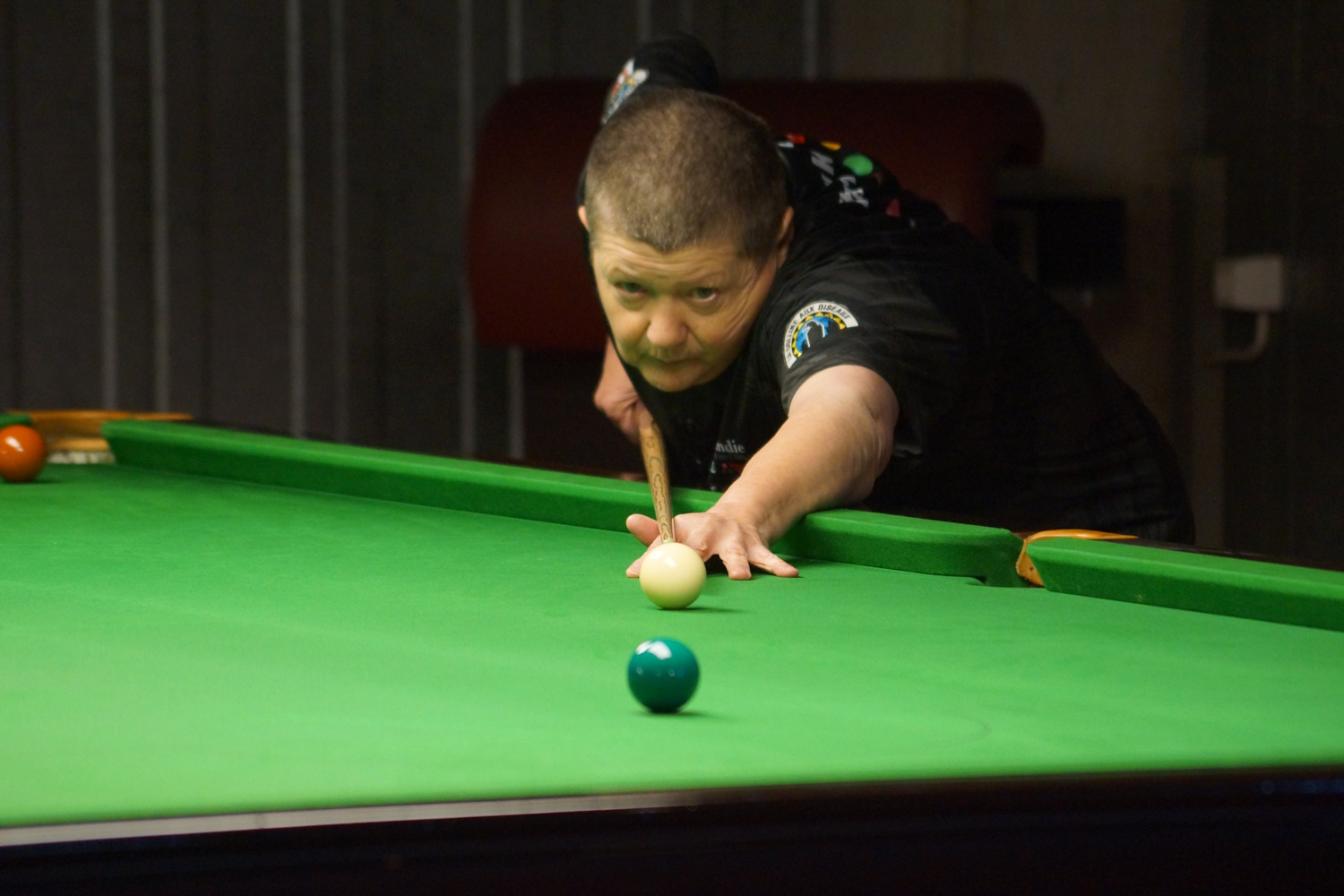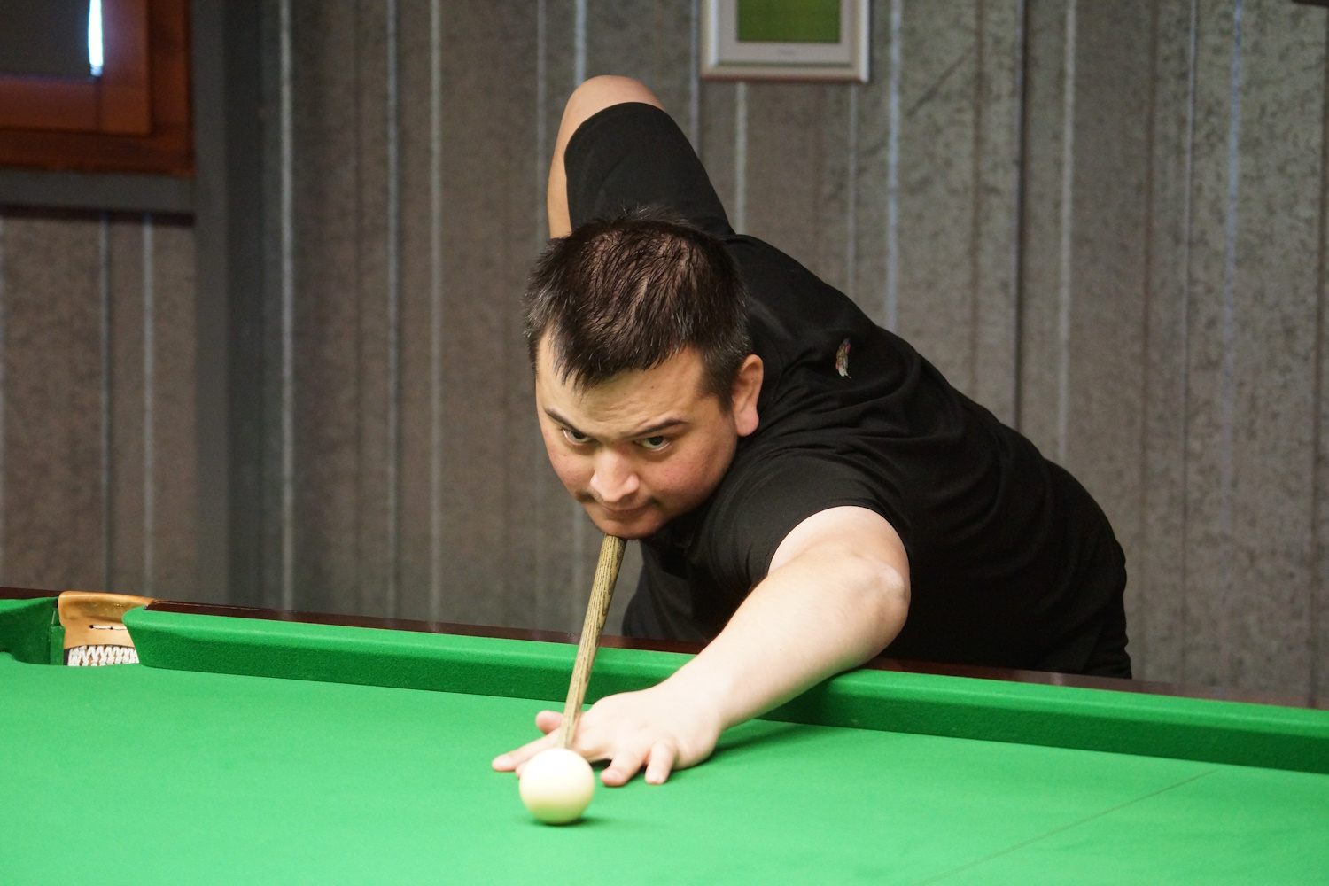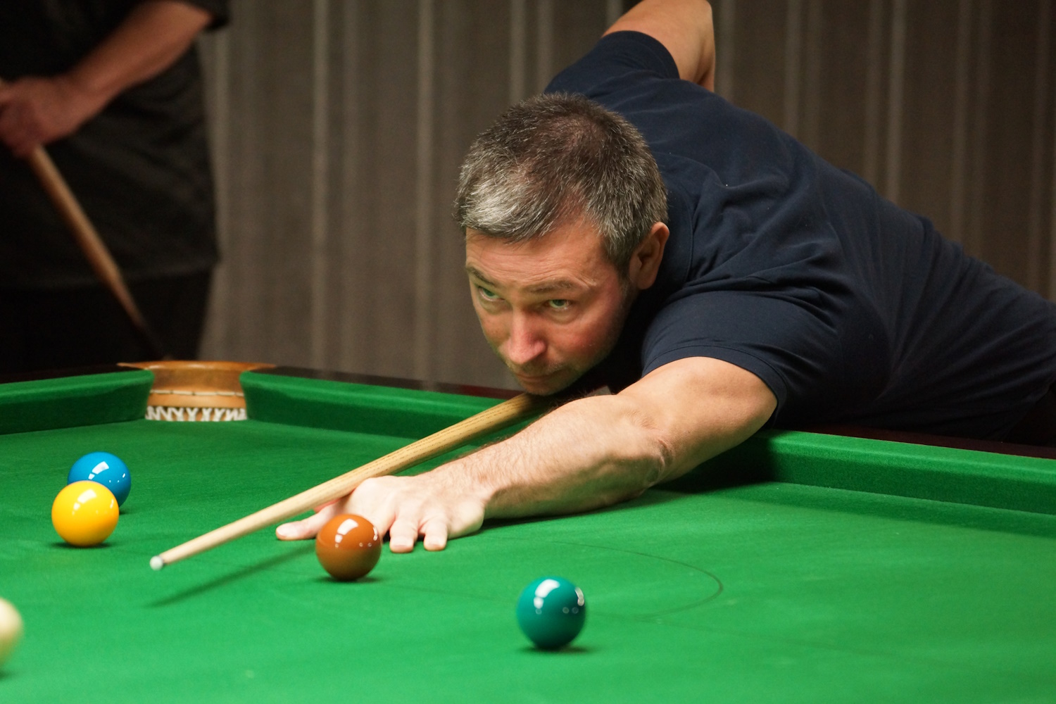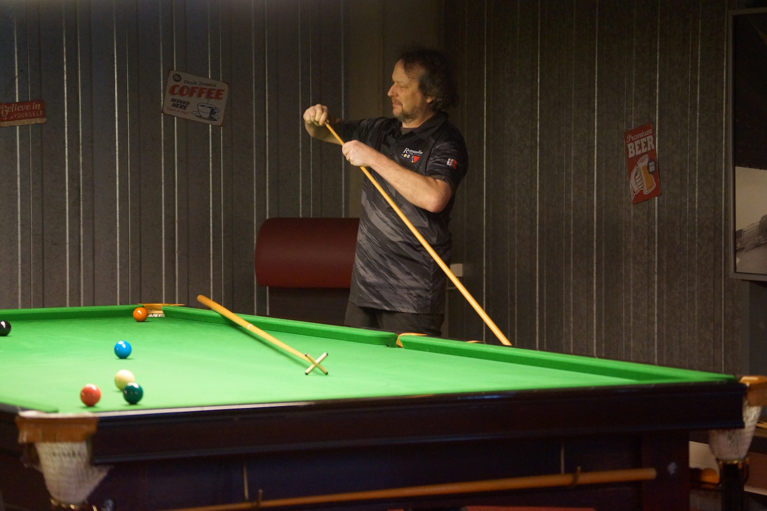 Die beiden Berner Klubkollegen lieferten sich eine lange Abnützungsschlacht, welche den anderen Spielern eine längere Pause ermöglichte. Gabriel lag bereits mit 2:0 vorne, als es ihm nicht gelang, den Sack zuzumachen. Marco (the Chester) biss sich fest, kämpfte sich zurück und erzwang den Decider. Da ging ihm dann allerdings die Puste aus und er ärgerte sich gewaltig über sich selbst, hatte er doch seinem Gegner gleich mehrfach die Bälle vor die Taschen gelegt.